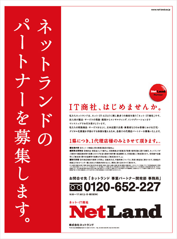 ネット・IT商社の「ネットランド」では、 全国のお客様にネットIT商品をお届けする体制を整える為、各県で商品をお取扱い頂く代理店パートナーの募集を開始いたしました。 詳しい内容に関するご質問や、詳しい資料のご請求は下記より承っております。